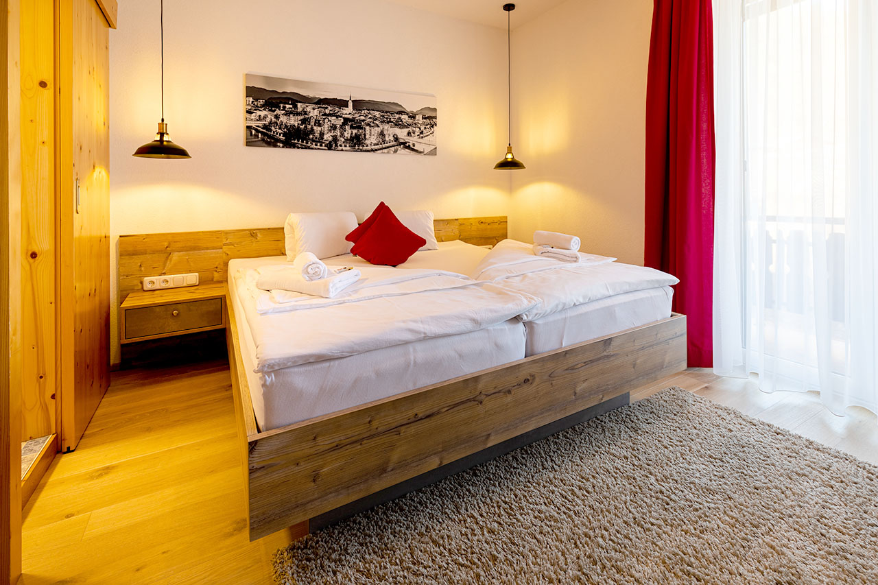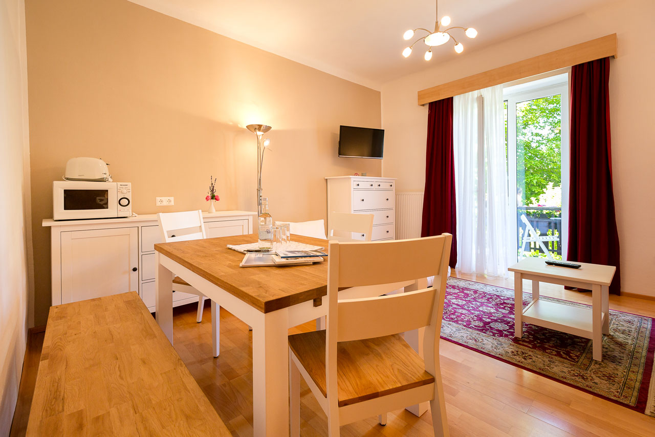 In unserem Haupthaus – der Villa Marienhof – sind auch stilvolle Apartments für Selbstverpfleger verfügbar. Jedes einzelne ein Unikat, behutsam renoviert und mit Liebe zum Detail eingerichtet. Gemein ist Ihnen immer ein wunderbarer Ausblick in Richtung des glänzenden Sees, der herrschaftlichen Burgruine Landskron oder in unseren liebevoll gepflegten Garten. Das besondere Flair der Villa spiegelt ganz besonders in den Gängen wieder, wo teilweise die originalen Dielen erhalten sind.